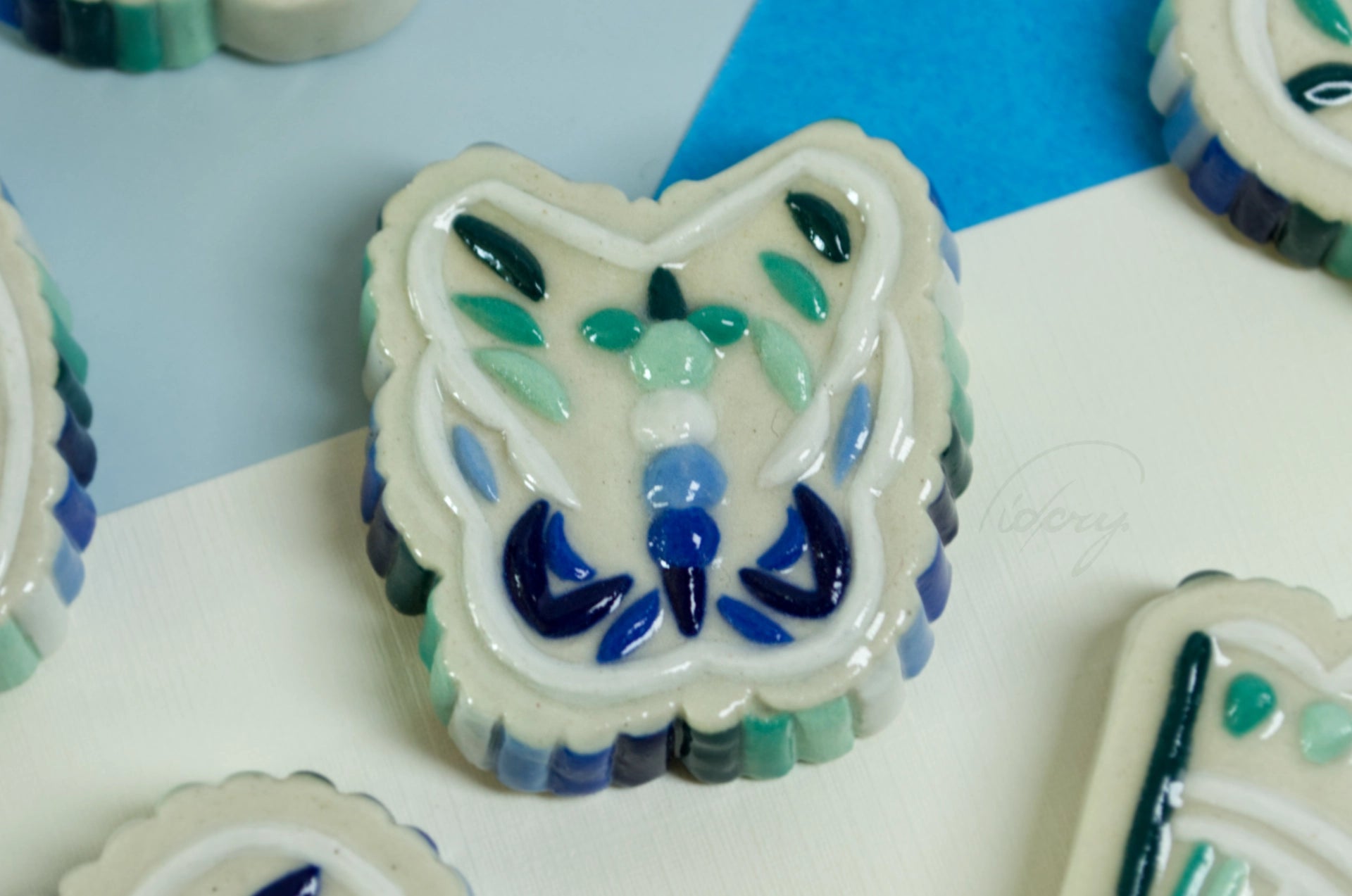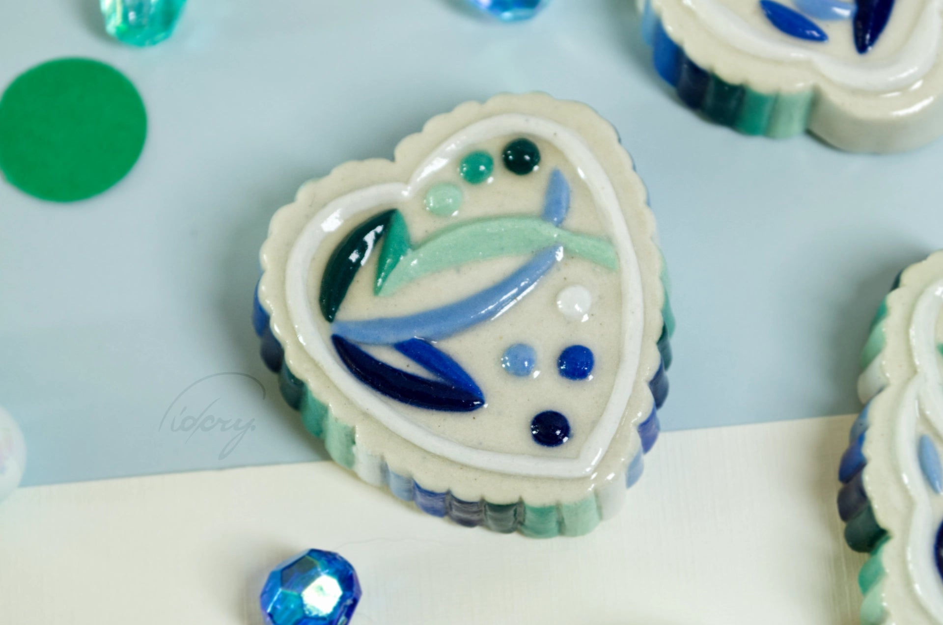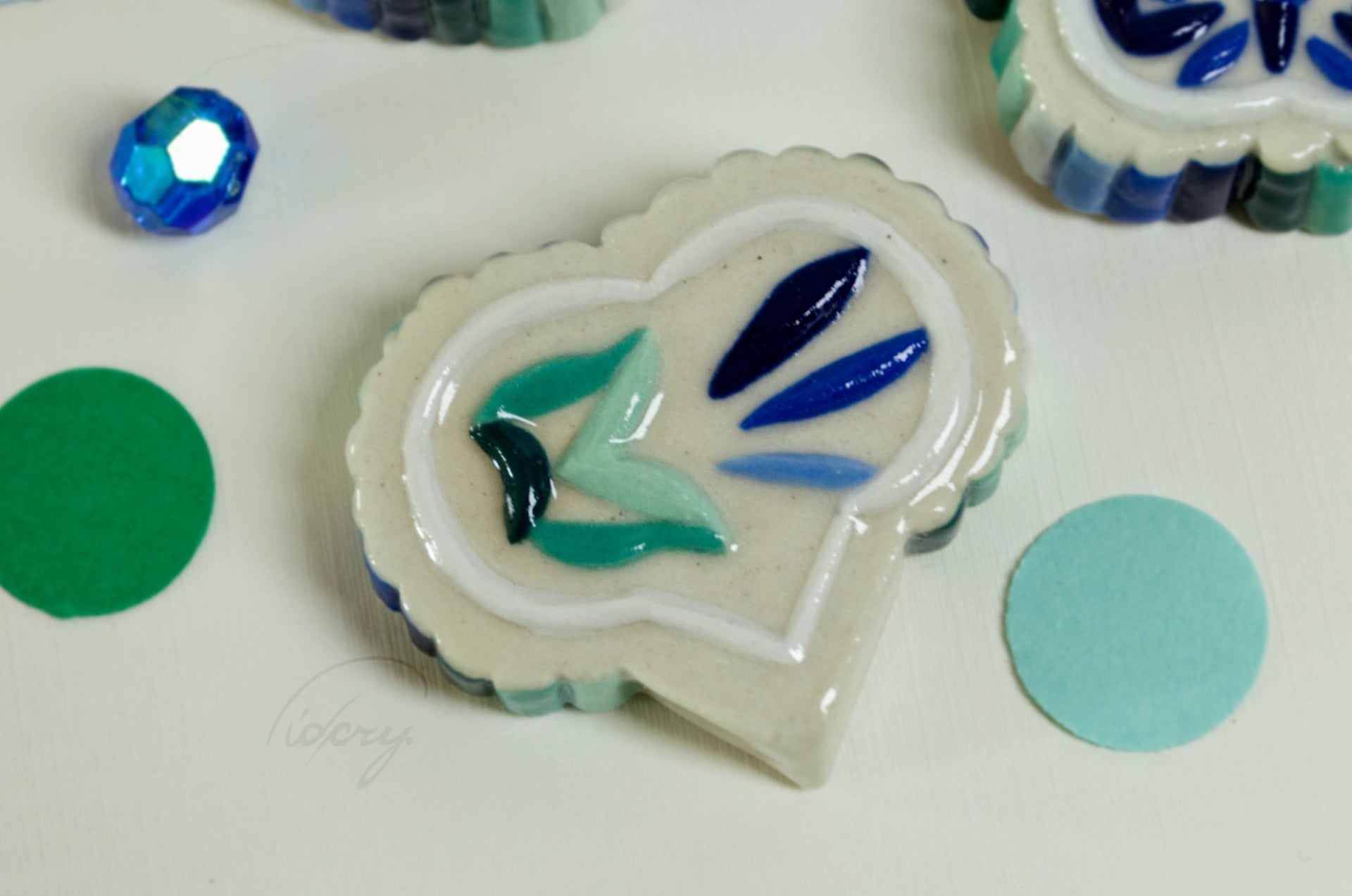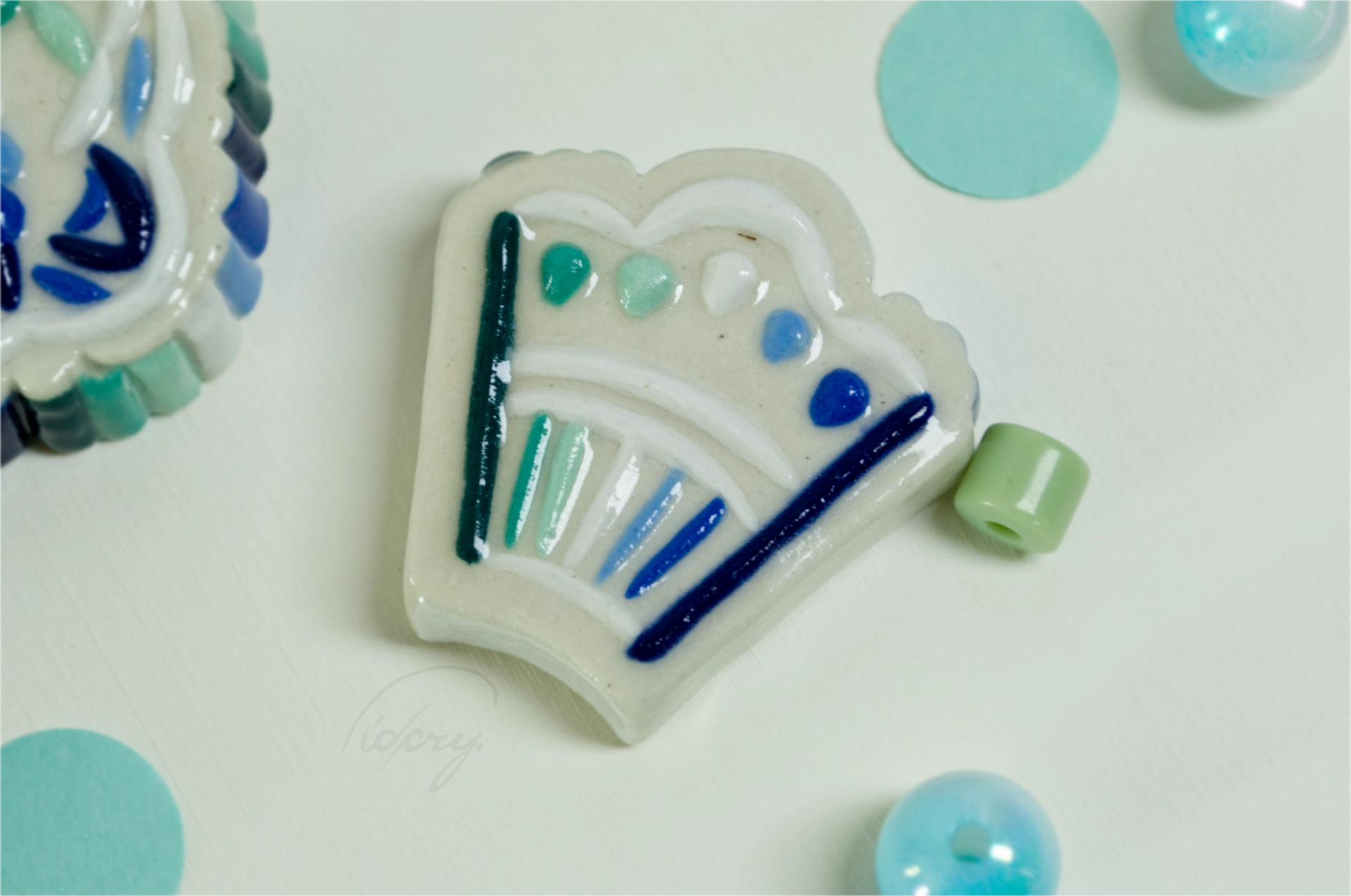 Essentially a little ceramic "stone" with ribbed and decorative relief, in MLM flag colors. White stoneware is pressed into a press mold, cleaned up, painted with underglaze, and coated in a clear glaze.