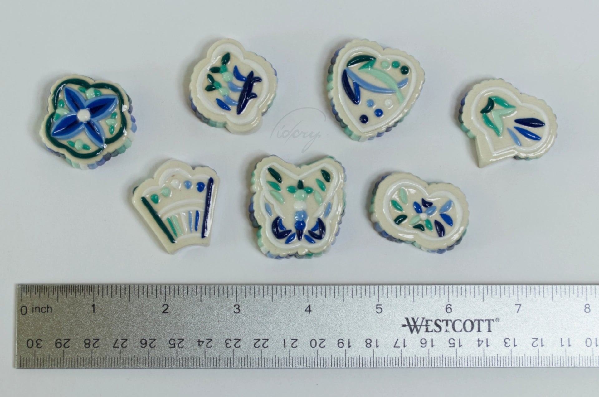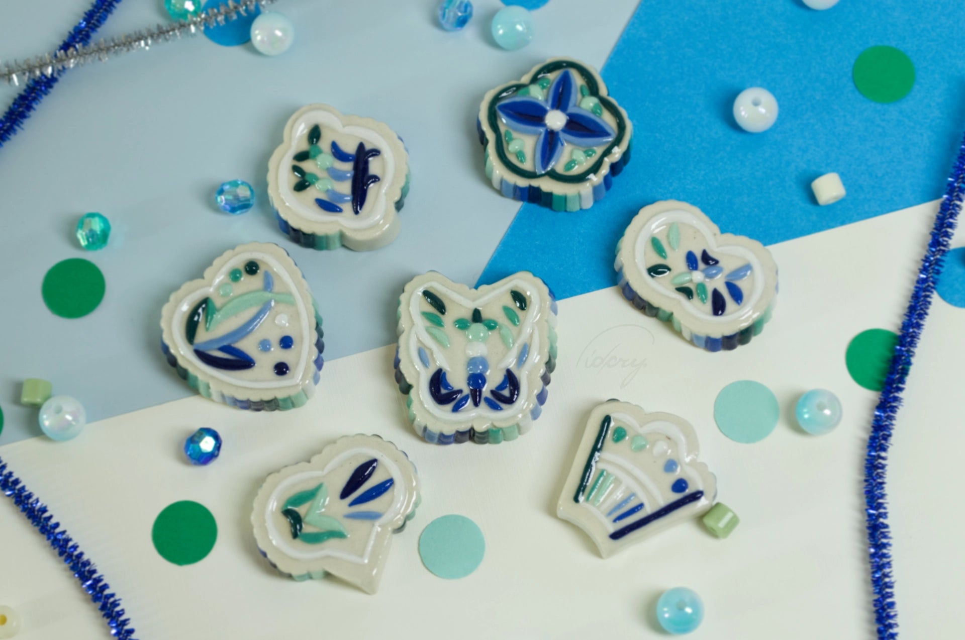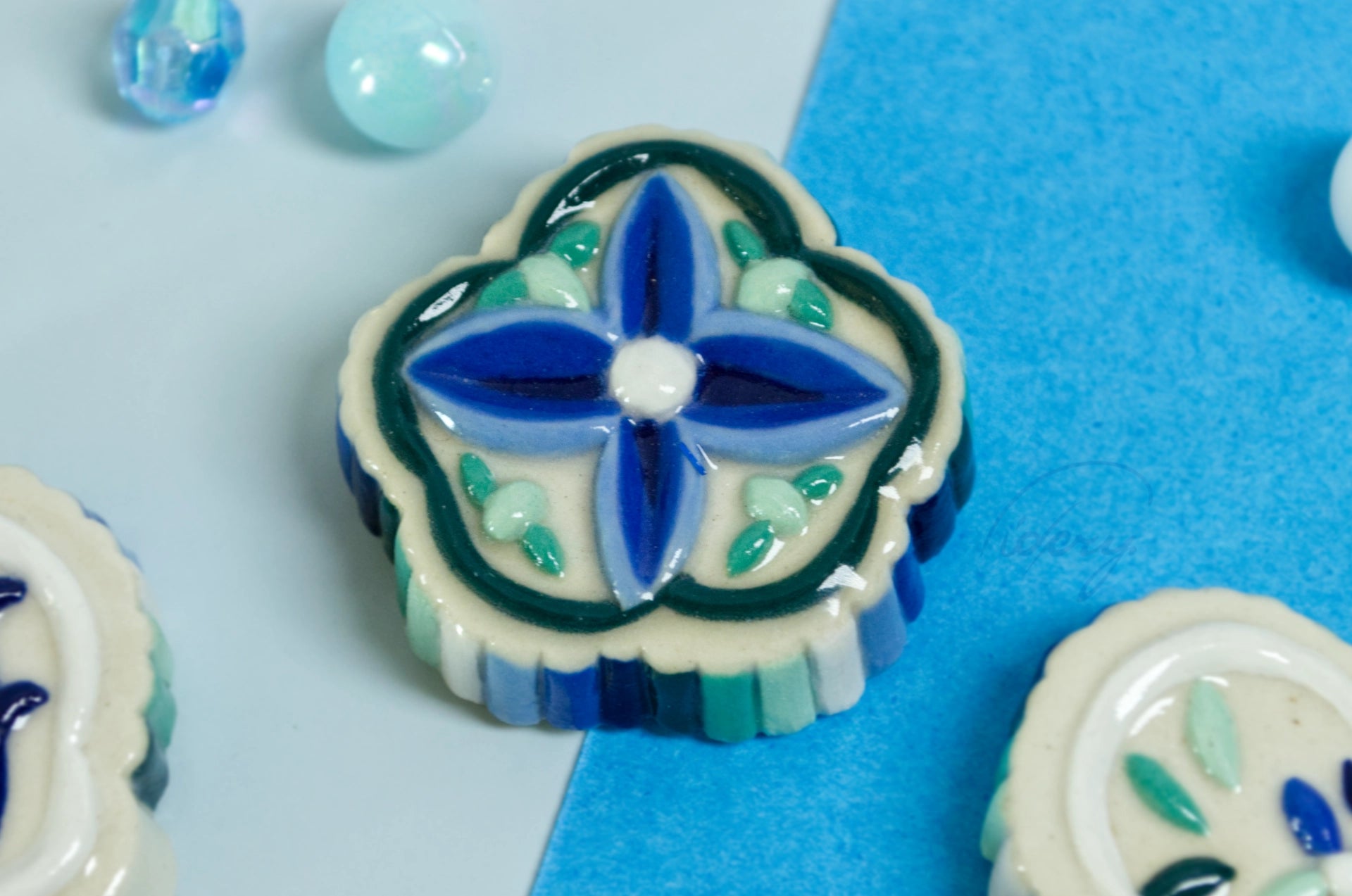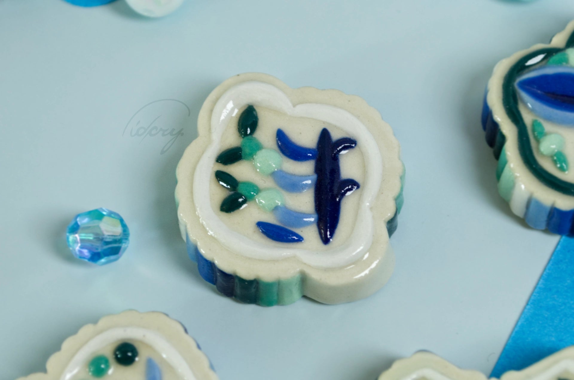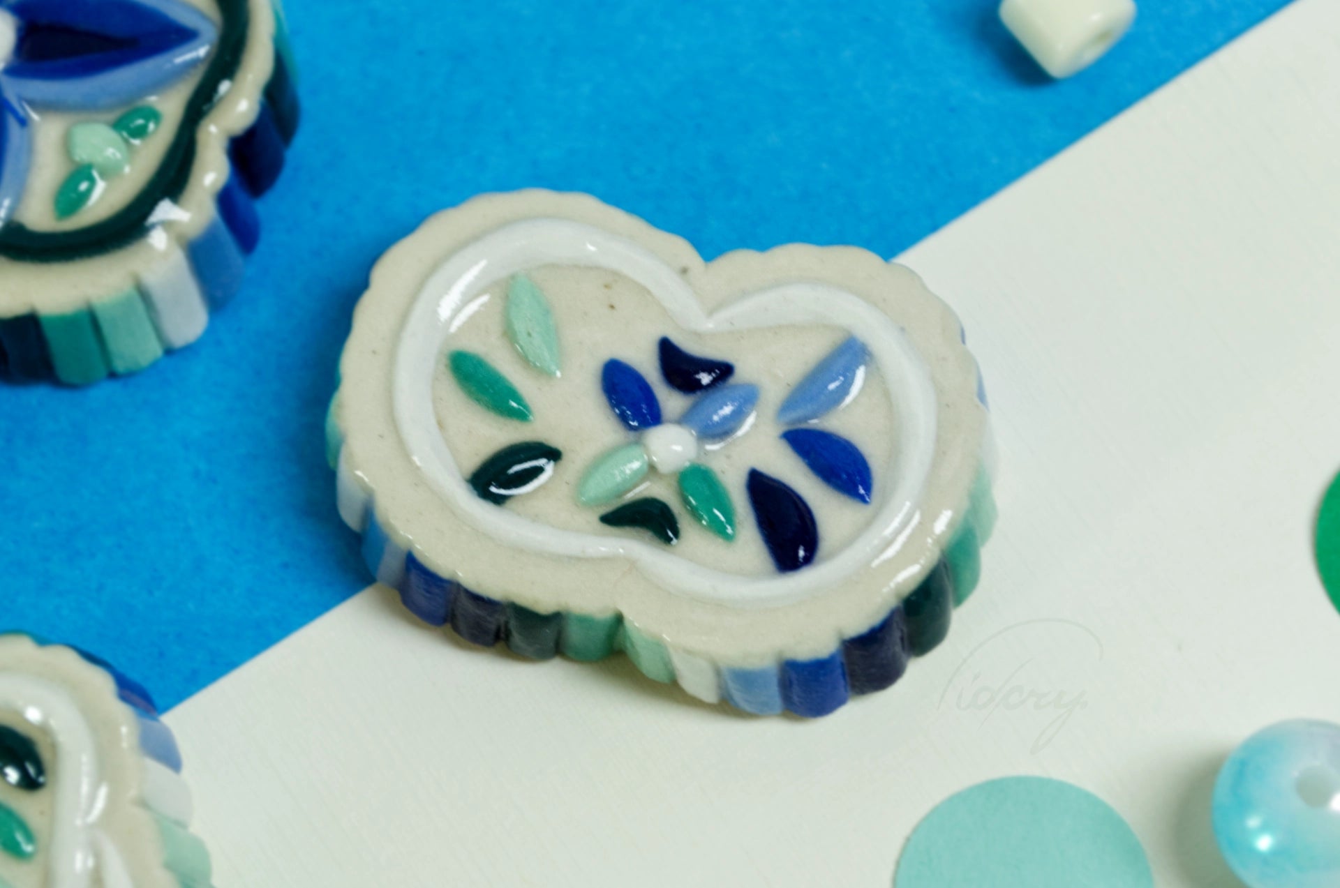 Essentially a little ceramic "stone" with ribbed and decorative relief, in MLM flag colors. White stoneware is pressed into a press mold, cleaned up, painted with underglaze, and coated in a clear glaze.
